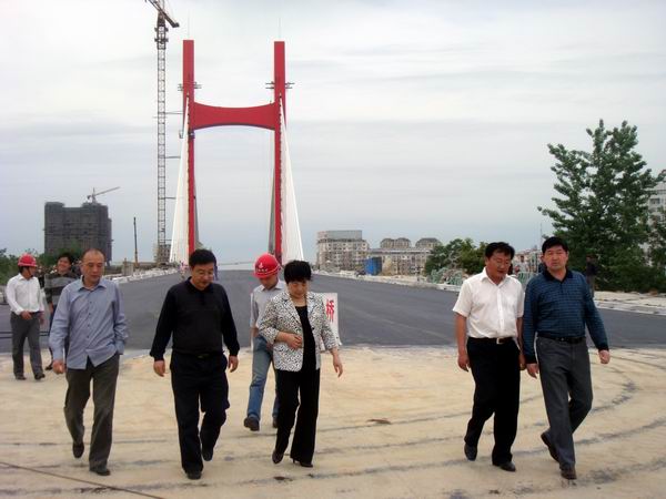 朱紅的索塔雄偉絢麗,扇狀的斜拉索似一雙巨大而潔白的羽翼,剛攤鋪好瀝青的橋面黑亮寬敞而又整潔順暢……遠遠望去整個大橋氣勢恢宏、身姿優美,似長龍橫臥,如彩虹飛架,在藍天白云、碧波綠水的映襯下顯得格外的雄偉壯麗。李喬書記對大橋壯麗的景色表示滿意,并對我部保質保量如期圓滿的完成大橋主體工程施工予以了充分肯定和贊許,并勉勵項目部乘勢而上,做好大橋后續收尾工作。