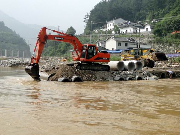 從27日開始,天氣放晴,水位下降,我部抓住機會進行第三次搶修,一臺挖機、一臺裝載機和五臺運輸車同時作業,終于在28日上午打通便橋。項目部迅速組織人員把施工設備、施工材料調運到對面,28日下午恢復小型結構物施工。