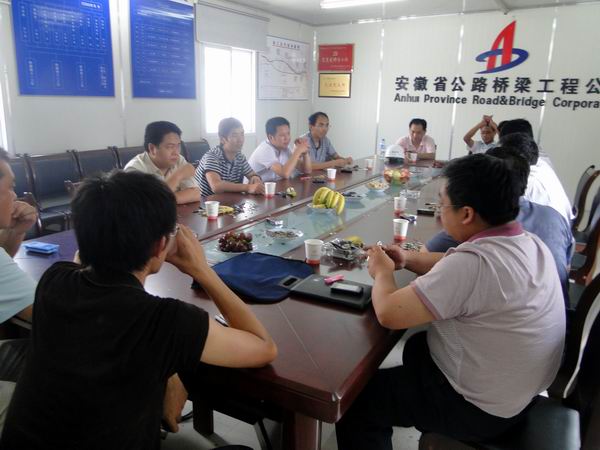 檢查組一行首先來到項目部召開會議聽取我部工作匯報,并進行內業資料檢查。項目經理王遠勝向檢查組一行匯報了我部抗擊715洪災和災后重建工作開展情況??偣顷痪臀也繕蛄菏┕べ|量控制體系、流程和施工進度進行匯報。試驗室、質檢部分別向檢查組匯報了我部試驗工作、質量控制和內業資料完善等情況。