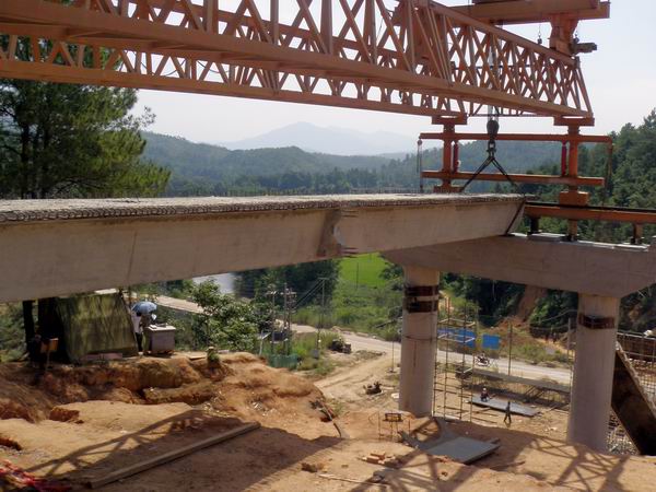 為了確保架梁工作的順利開展,項目部領導到現場指導架橋機的拼裝、檢驗等工作,通過對架梁人員進行分部分項技術交底,讓所有現場作業(yè)人員都能做到熟捻于心。經過施工人員精心施工,努力奮斗,于10月2日完成架橋機拼裝,10月3日完成調試。10月5日,在項目部領導、監(jiān)理和駐地辦領導的共同指揮下,我標段首片箱梁成功架設。現場鞭炮齊鳴,掌聲如雷,為國慶增添新的喜慶。