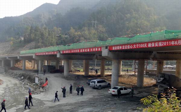 王家溝大橋設(shè)計(jì)為8孔20米,橋梁全長170.08米,共8跨28根立柱,144塊梁板,上部構(gòu)造為20米跨徑預(yù)應(yīng)力空心板,下部構(gòu)造橋墩為柱式敦、樁基礎(chǔ),橋臺為u型臺擴(kuò)基、柱式臺樁基。從2009年12月份開始樁基挖空施工,克服了挖孔巖石堅(jiān)硬、反復(fù)滲水的地質(zhì)困難,經(jīng)受住7月15日特大洪水和8月6日龍卷風(fēng)考驗(yàn),順利于6月份完成立柱施工,8月開始進(jìn)行橋臺施工,9月6日開始梁板架設(shè)。在梁板架設(shè)的同時(shí),橋面連接施工也已經(jīng)展開,截止11月8日,橋面連接施工只剩下最后一跨。