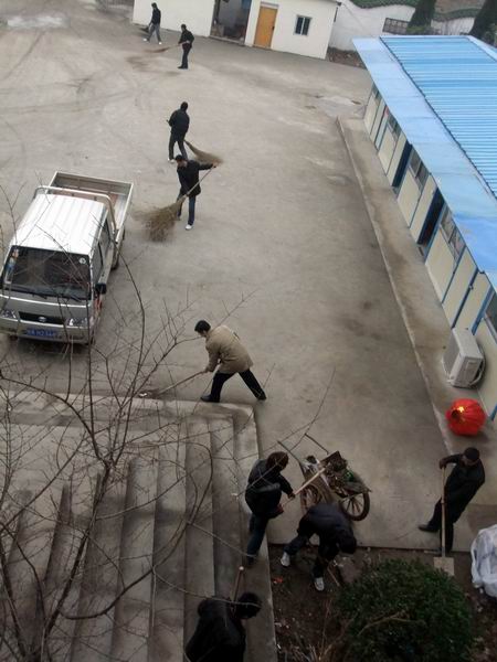 同志們各持工具,有說有笑,一時間項目部呈現出一派熱火朝天的景象。經過將近3個小時的清理,項目部樓道、廁所、花壇、廣場都煥然一新。