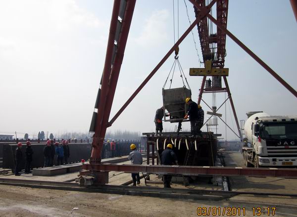 為確保此次箱梁澆筑過程萬無一失,項目部精心制定澆筑施工方案,提前做好各項準備工作。項目部對澆筑設備及混凝土進行反復檢驗,制定應急預案,要求全體人員在澆筑過程中樹立高度的責任心,保證整個澆筑過程安全、有序。隨著砼灌車進入梁場,試吊、起吊、前移、就位、澆筑,一串協調而又連貫的運作之后,第一片箱梁成功澆筑。
