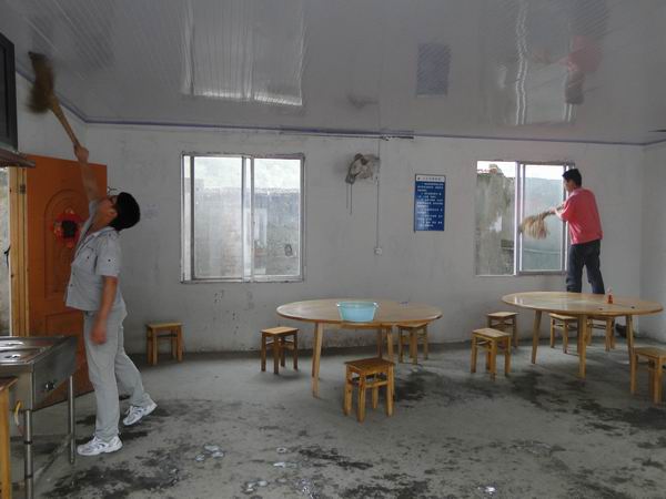 下午5點,按照先前的分工,各部門的團員都積極行動起來。試驗室負(fù)責(zé)餐廳生活區(qū),工程部、質(zhì)檢部負(fù)責(zé)宿舍樓,其余部門負(fù)責(zé)辦公走廊及前場活動區(qū)域的衛(wèi)生打掃。清洗桌子,擦洗門窗、打掃走廊,清理枯枝敗葉,經(jīng)過兩小時的辛勤勞動,整個項目部煥然一新。