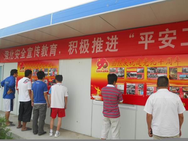 《黨旗永遠飄揚》系列圖片展用大量翔實的資料照片生動地展現了中國共產黨90年來的輝煌成就。大家一邊觀看一邊激動地議論和感慨:“有了共產黨,才有了中國翻天覆地的變化,才有了中國繁榮富強的今天”。通過參觀,更加激發了員工們對中國共產黨的熱愛之情,堅定了大家的理想信念;激勵了項目一線員工更加積極的投入到蚌淮高速的施工建設,為實現公司的“十二五”戰略規劃做出自己應有的貢獻。晚上7點,在項目操場上,露天展映的抗日戰爭影片有紅色經典影片《七七事變》、《狼牙山五壯士》、《地道戰》,讓大家又受了一次紅色精神的洗禮。