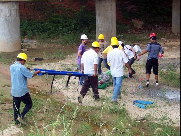 接下來,對參演人員進行角色分工和任務分配。所有參加演練的人員來到項目正在進行的30米箱梁預制場門架附近待命。4點鐘,演練行動正式開始。項目負責人接到報告,K11+300水陽江1#橋面施工區域發生高墜事故。由于水陽江橋施工現場地處偏遠,距離主干道路和項目部及醫院都較遠,給自救和救援帶來嚴重考驗。搶救疏散組及時啟動《高墜事故應急救援預案》,在以項目經理為主的事故應急救援領導小組領導下,各事故應急救援機構各司其職。搶救疏散組立即組織搶救受傷人員,將汽車、設備、救護人員派到事發地點,并對現場人員進行疏散隔離。救護人員第一時間對高墜傷者進行了初步檢查,判定傷者暫時沒有生命危險,并對其發生骨折的右上肢進行了夾板保護,在搶救疏散組的協作下,傷者立即通過擔架進行轉移,送往醫院。