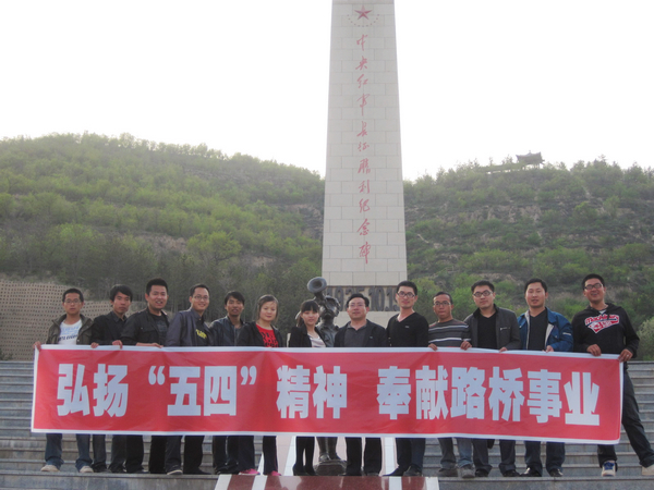 為不影響施工生產,活動選擇在下午6點進行。項目經理帶領全體青年團員前往吳起縣中央紅軍與陜北紅軍會師地吳起縣中央紅軍革命紀念園,接受紅色教育。項目部全體青年團員順著革命先輩踏過的臺梯,一步步的登上中央紅軍長征勝利紀念碑的腳下,共同拉著“弘揚五四精神奉獻路橋事業”的宣傳標語進行合影留念。