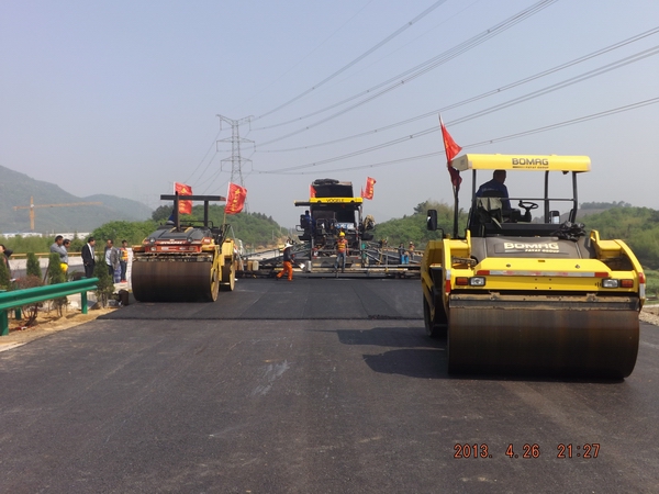 為保證此次試驗段攤鋪順利進行,項目部于4月25日晚召開專項會議,對各施工班組及機械操作人員進行詳細的技術、安全交底,對整個施工過程的各個環節進行了詳細確認,將責任、要求細化到個人。會議強調在施工過程中要嚴把質量關,瀝青出場溫度、到場溫度、攤鋪溫度、初壓溫度、復壓溫度、終壓溫度等相關指數均要在設計范圍內,同時,安全保障措施等也要控制到位。